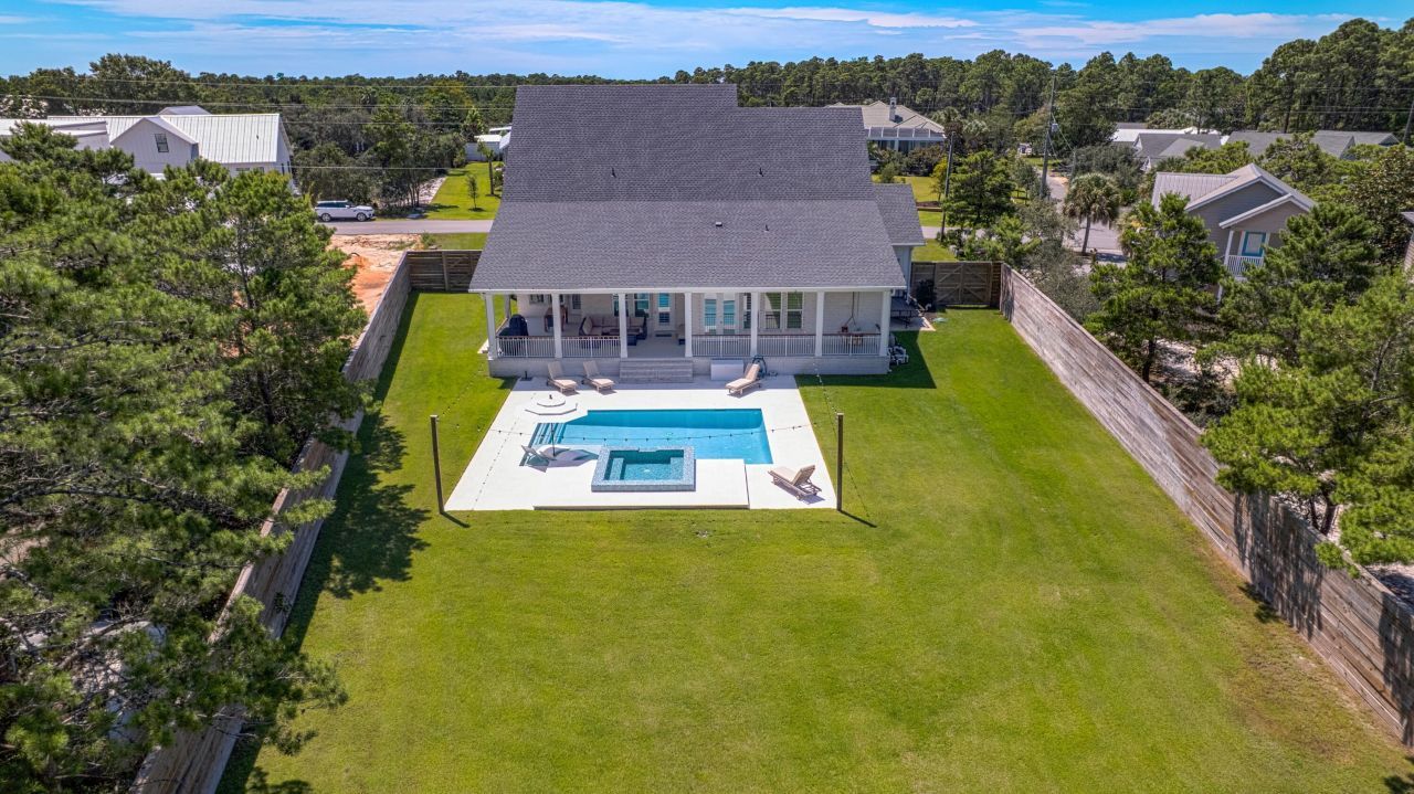 Rare 0.57-acre 30A retreat in Santa Rosa Ridge. Custom-built by Randy Wise Builders. Just a half mile from the Gulf and 40+ feet above sea level. Enjoy 10-ft ceilings, open floor design, luxury kitchen, 10-ft island, walk-in pantry, and ceiling-height custom cabinetry. The dining area opens to a spacious lanai, with room for lounging and outdoor dining overlooking the pool. The Primary Suite offers dual vanities, dual custom walk-in closets, and a 50-sq-ft heated shower. Main floor includes a guest suite and flex room. Upstairs: a wet bar including bev. cooler and ice maker, two bedrooms, and a 350-sq-ft entertainment room. Heated/cooled 3-car garage, year-round heated pool and spa. Plenty of space for boat/rv storage. Enough space to build a future Carriage House, Pool house etc. NO HOA